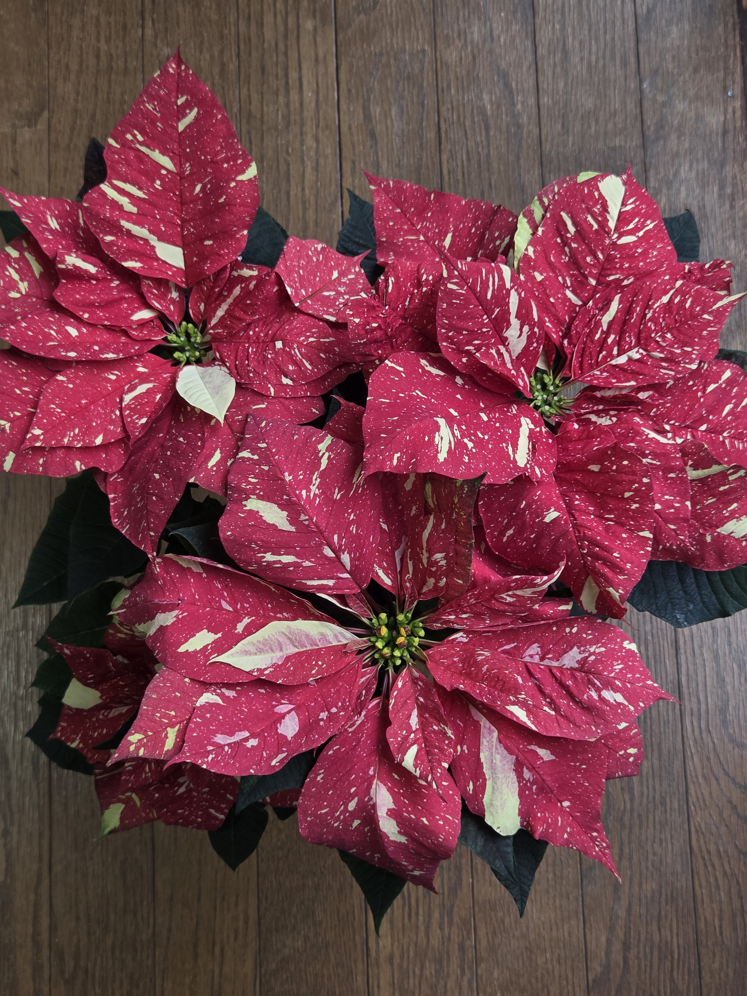 一つ一つ異なり雪が積もったように見えるポインセチア。