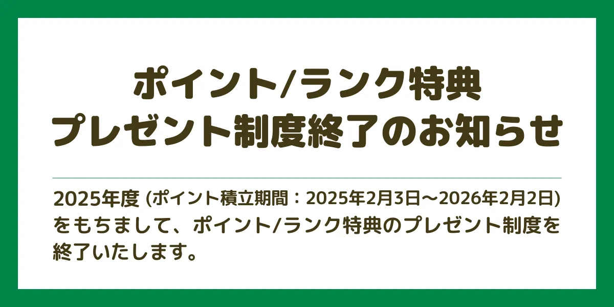 2025年度 (ポイント積立期間:2025年2月3日~2026年2月2日) をもちまして、ポイント/ランク特典のプレゼント制度を終了いたします。