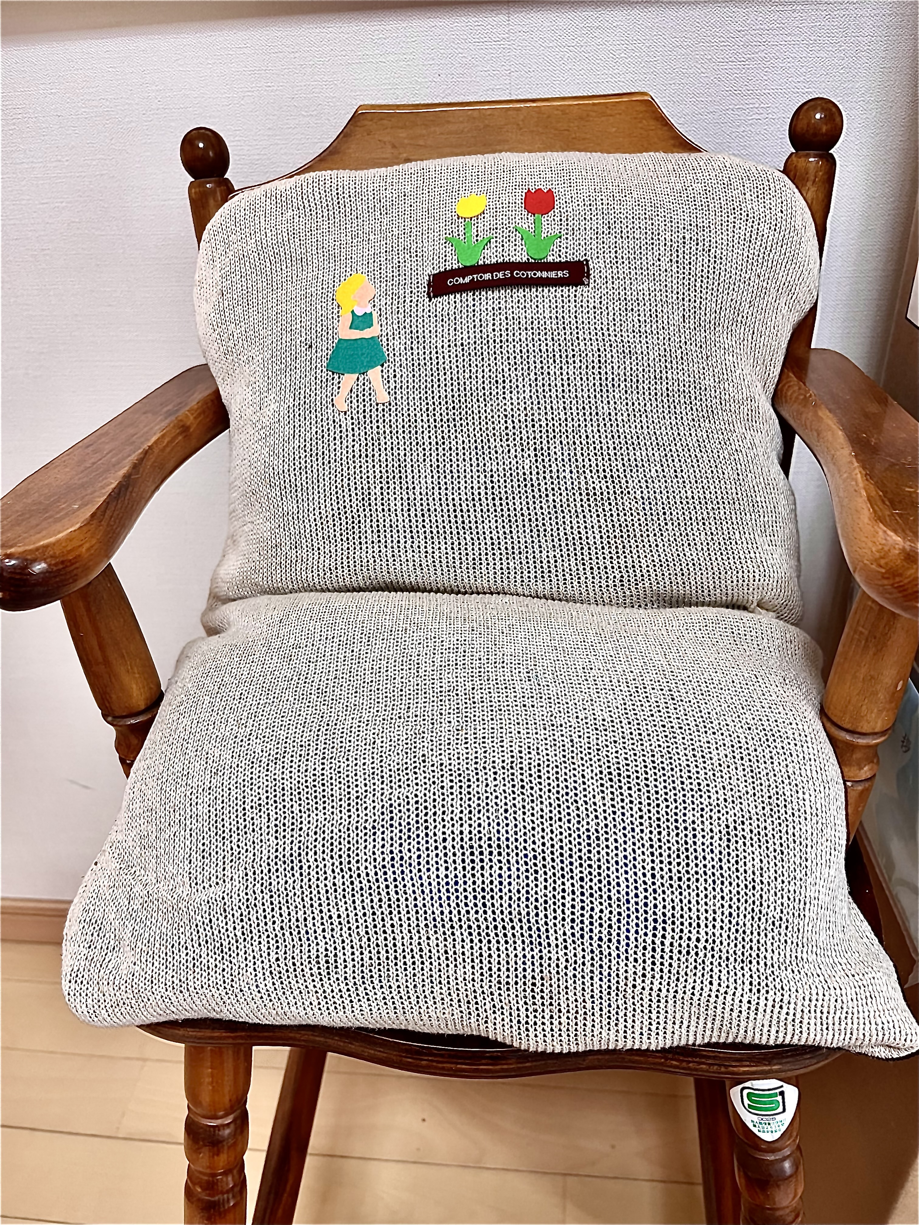 昨年末に孫娘の為にヤフオクで中古の幼児用椅子を買いました。今時のスタイリッシュな椅子とは違いますが、(こんなのウチにあったの?、と)息子たちが言うほどダイニングの他の椅子とも相性よく…でもクッションがなくて先日は取り敢えず薄い枕で凌ぎましたが、何かな😕 ということで、イトーキ(机など製造販売している企業さん)さんの優待でもらった元々はバスなど座席シート用の布のストール?を改造してシートにしました。お人形とチューリップのアップリケは昨年訪れた大阪の「子ども本の森 中之島」で購入したもの。エンジのリボンは愛用していた服のタグを再利用。