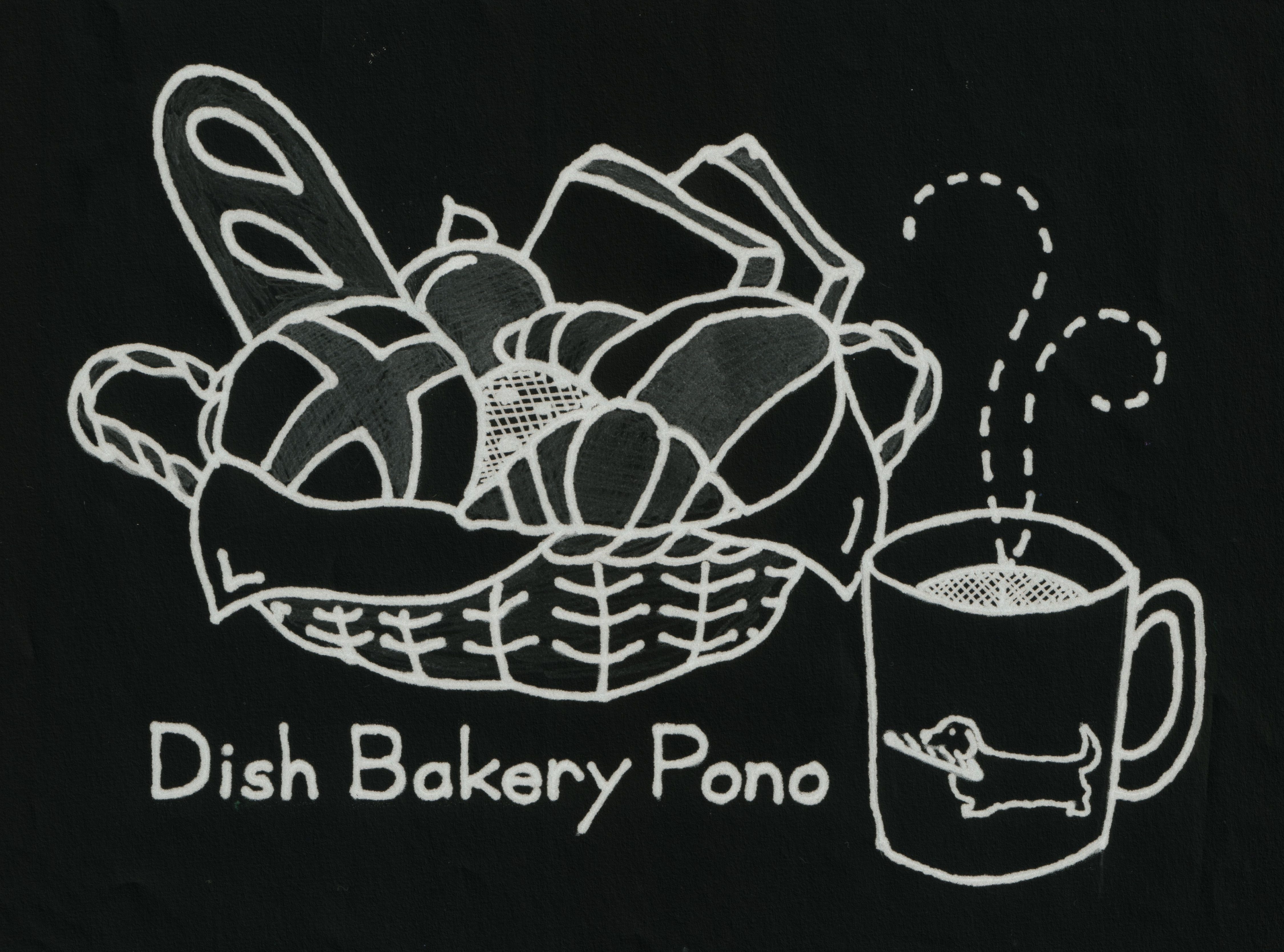 昨年12月からお手伝いをしている蒲田のパン屋さん、長女の友人が起ち上げたディッシュ ベーカリー ポノ。来月は創業1周年、記念にプレゼントを配布したいとのこと。黒地のエコバッグを予定していて、その絵を任されたので、まずはこんなデザイン案を描いてみた。ベタで無難過ぎるかな〜?
