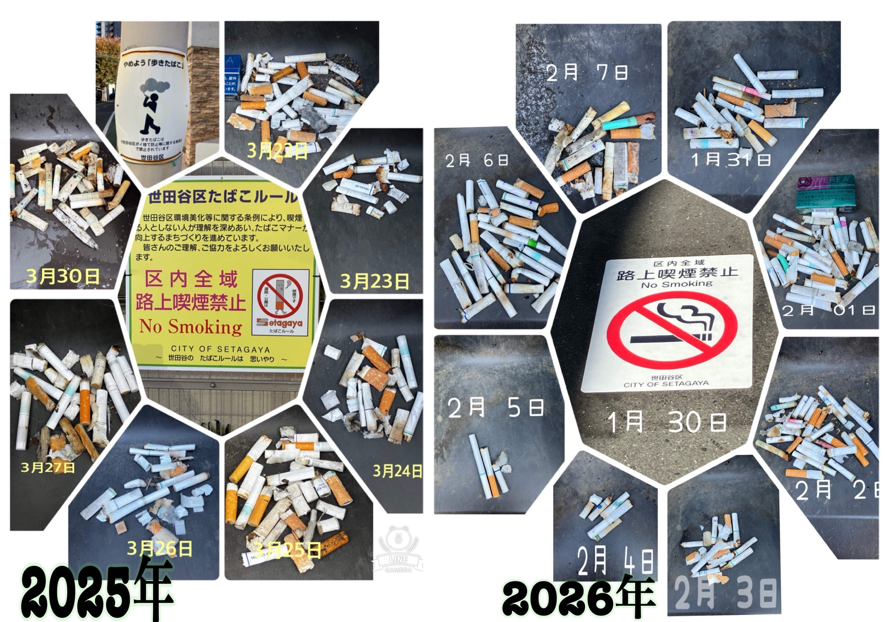 朝に向こう三軒両隣りの路上のゴミを取ってから翌日の朝までの間に吸い殻やタバコに起因するものが塵取りにこれだけ集まります。吸って投げ捨てたものや、風に運ばれてきたもの、また飛んで行ったものもあるでしょうが、路上に残っているのです。