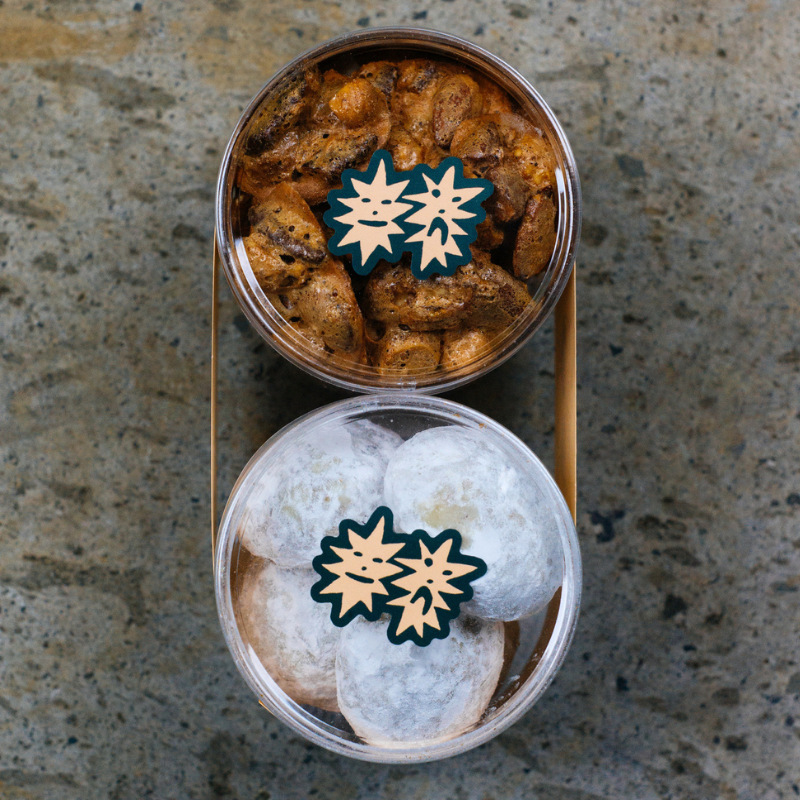 ●クッキー (2種類)。デカフェのクロッカン (茶色)、白 (広島和紅茶スノーボール)。