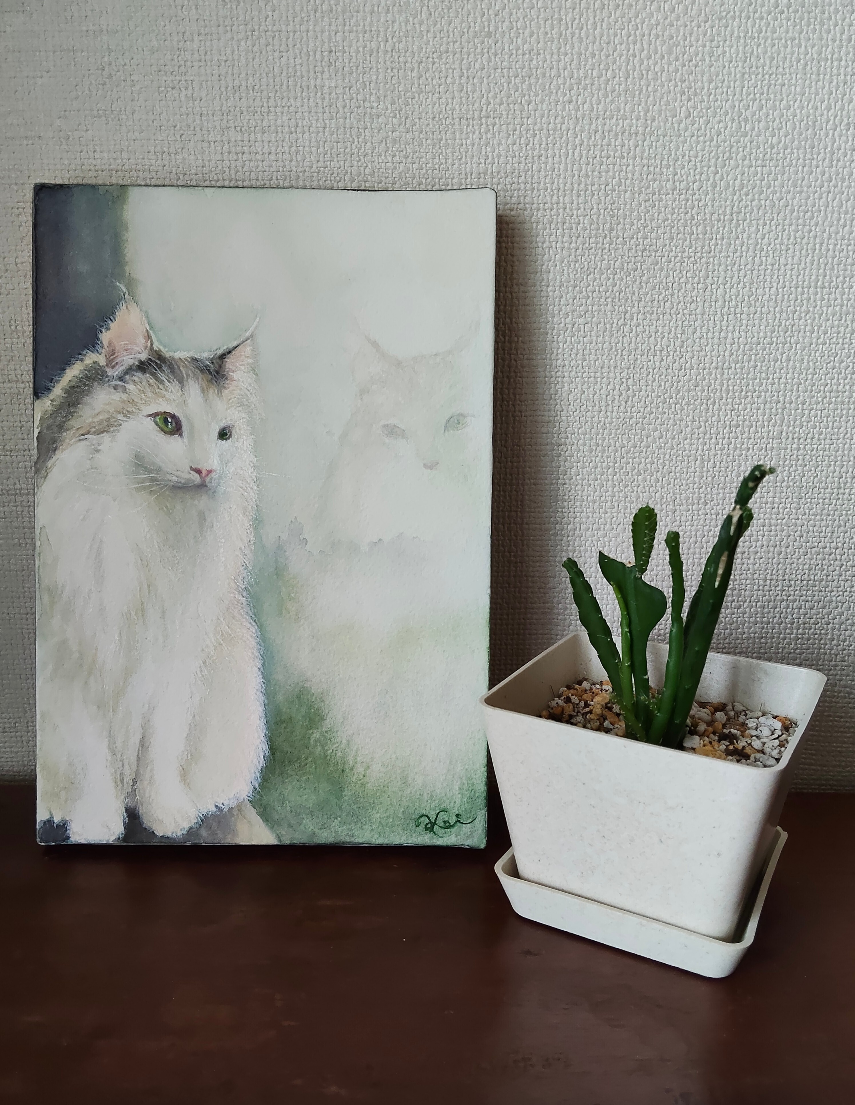 それで、1枚は冒頭の画像の絵。イルカラブさんにご投稿のお写真をお借りして、水彩で描いたノルウェージャンフォレストキャットのロイン嬢、出品させていただこうかと。