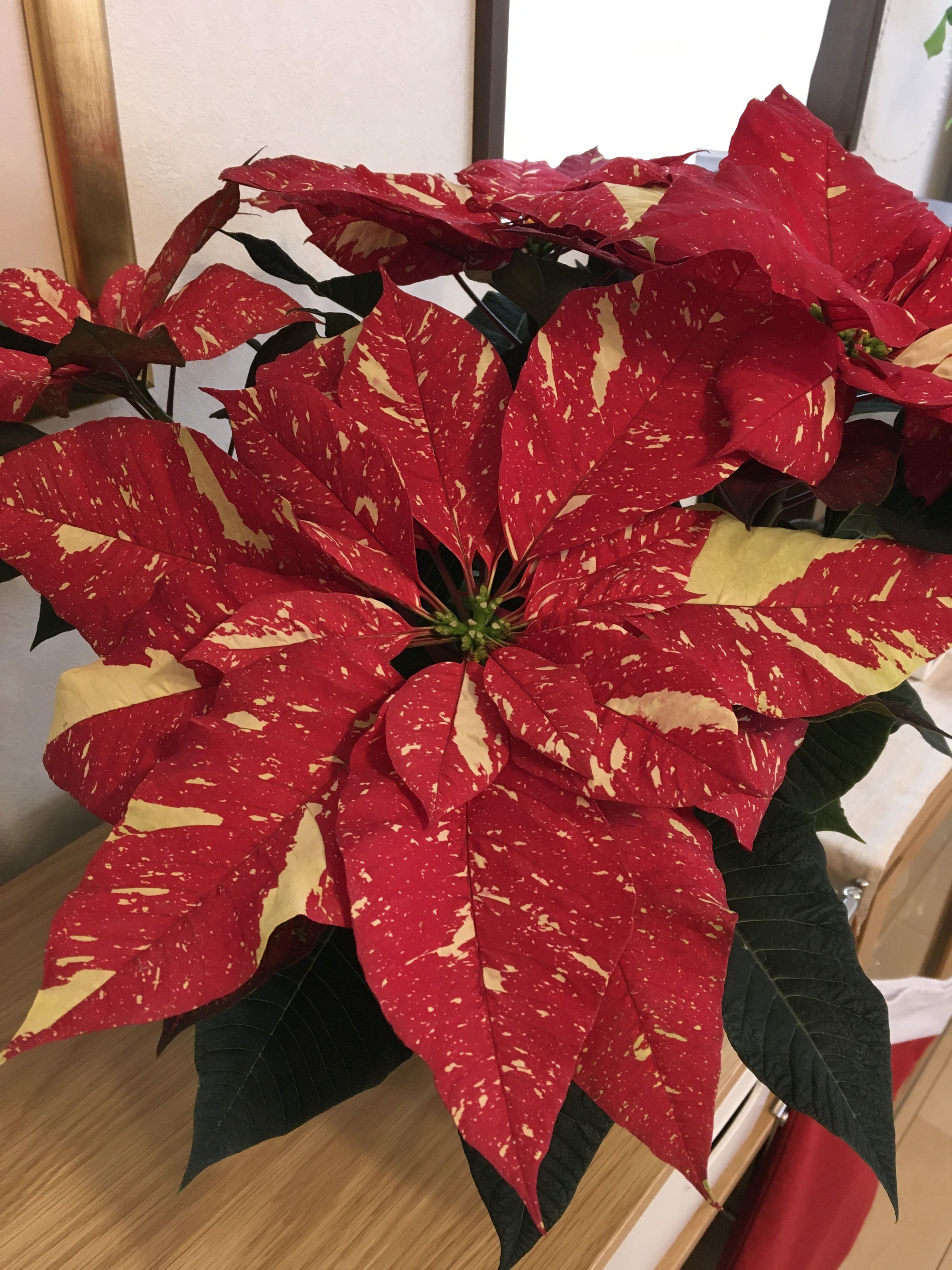 赤の苞に黄色の斑が入ったこちらのポインセチアは【マチネグリッター】という品種になります。