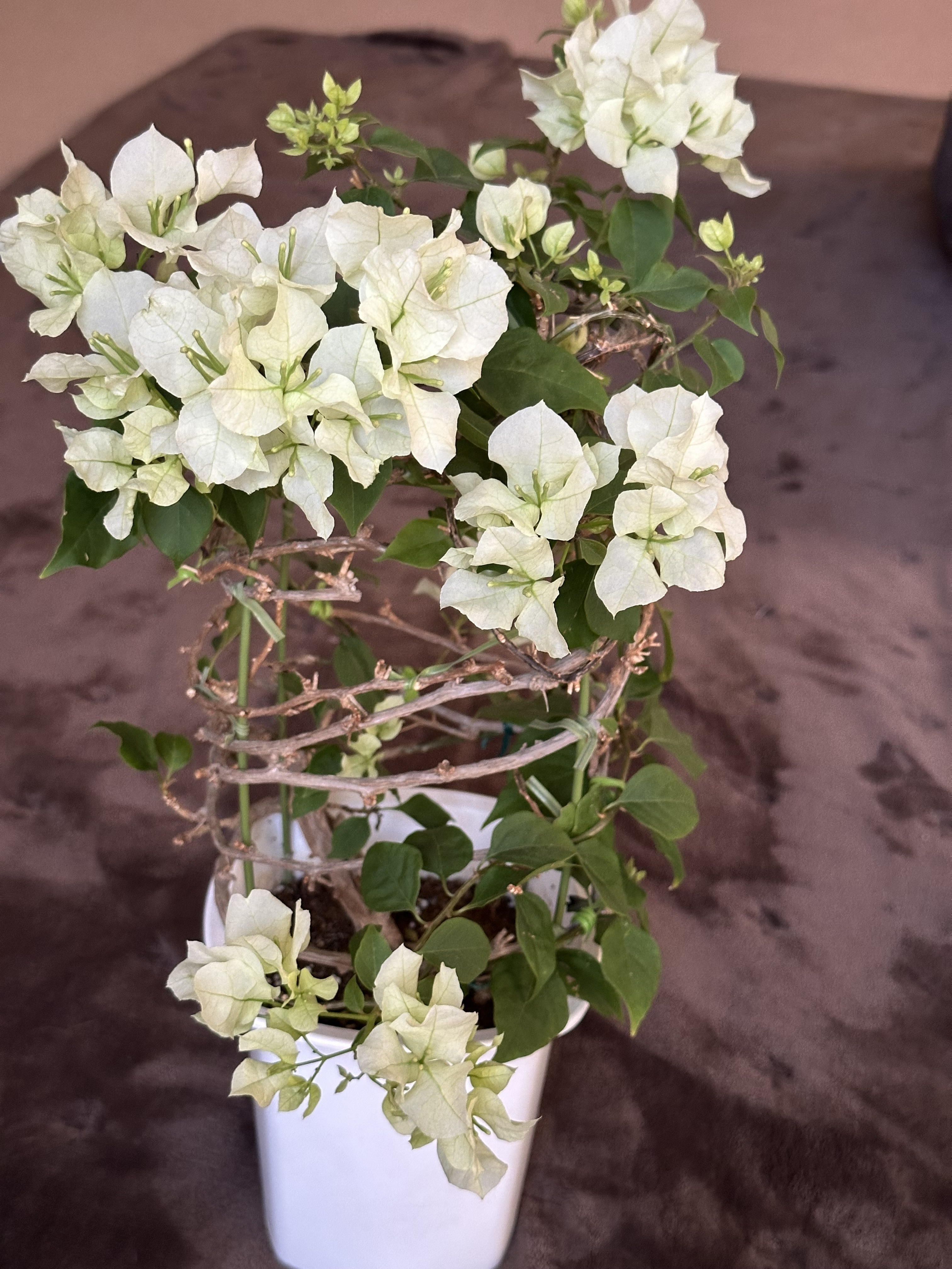 昨年いただいたブーゲンビリアが秋口から室内に取り込んだ後次々と苞をつけ咲き始めました!ただ日照が足りないせいか、白いお花(苞)になってしまいました🥲調べてみると白い苞になってしまった場合いくら日に当てても色は変わらないとのこと。悔しいけれど、今回は白いブーゲンビリアを楽しみつつ、また暖かくなってきたらお外に出して今度は可愛い薄ピンクのお花をたくさんにしたいです。
