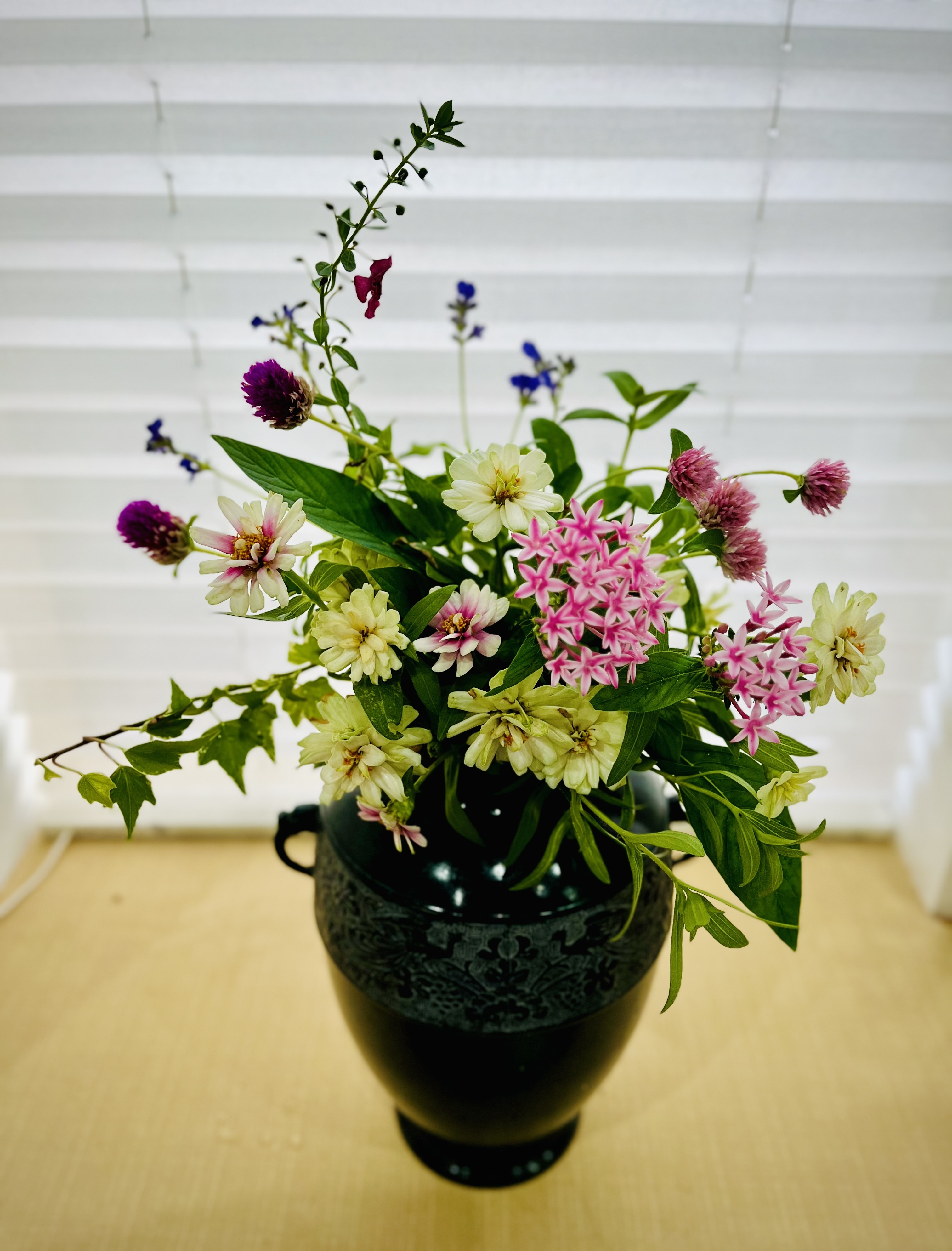 咲いていたお花を気ままに生けてみました。いくつかの寄せ植えから集まってきたメンパーですが、仲良く収まってくれて嬉しいです💖