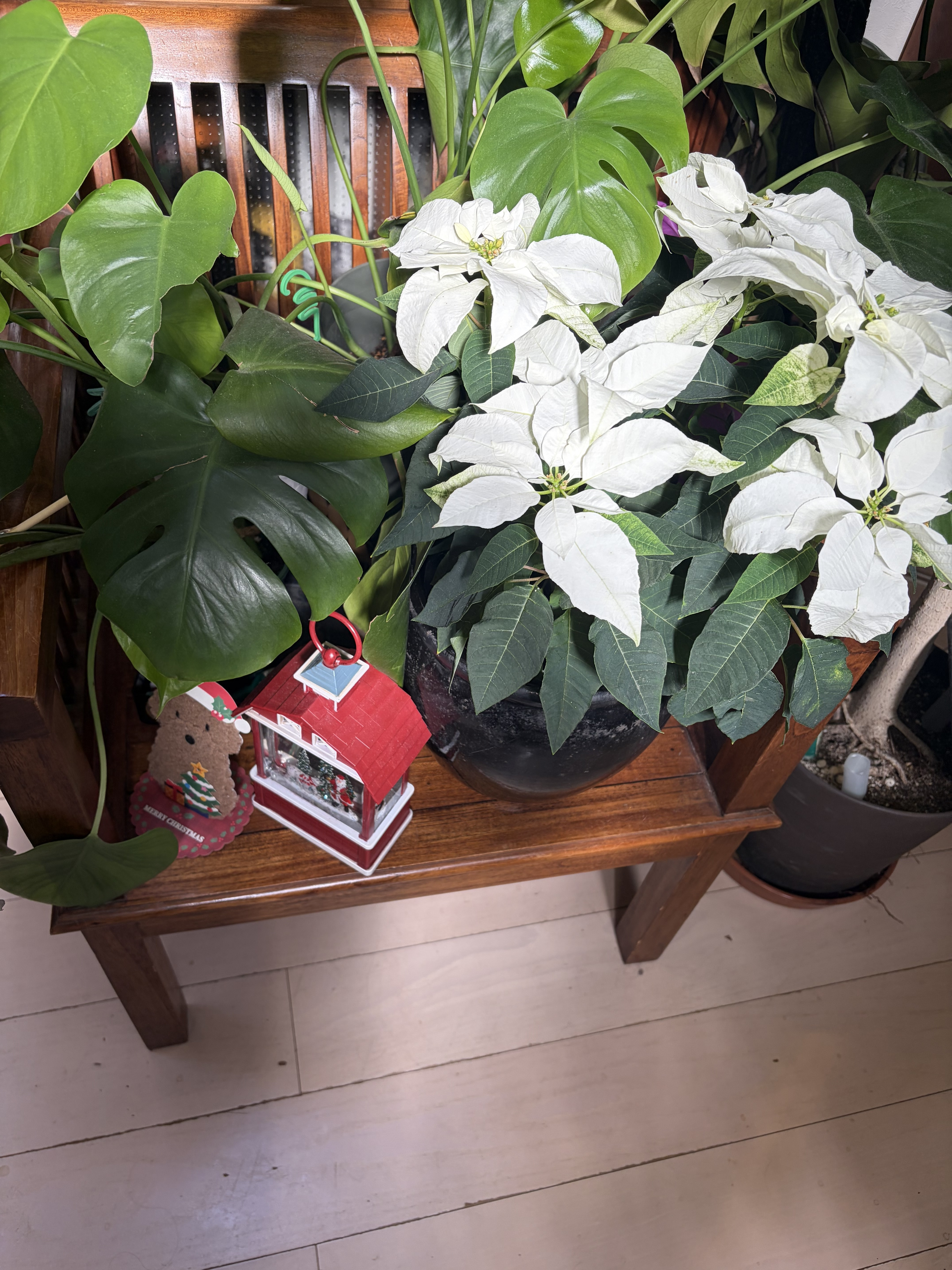 今日、真っ白なプリンセチアをお迎えしました。クリスマス、お正月 一緒に過ごそうね。