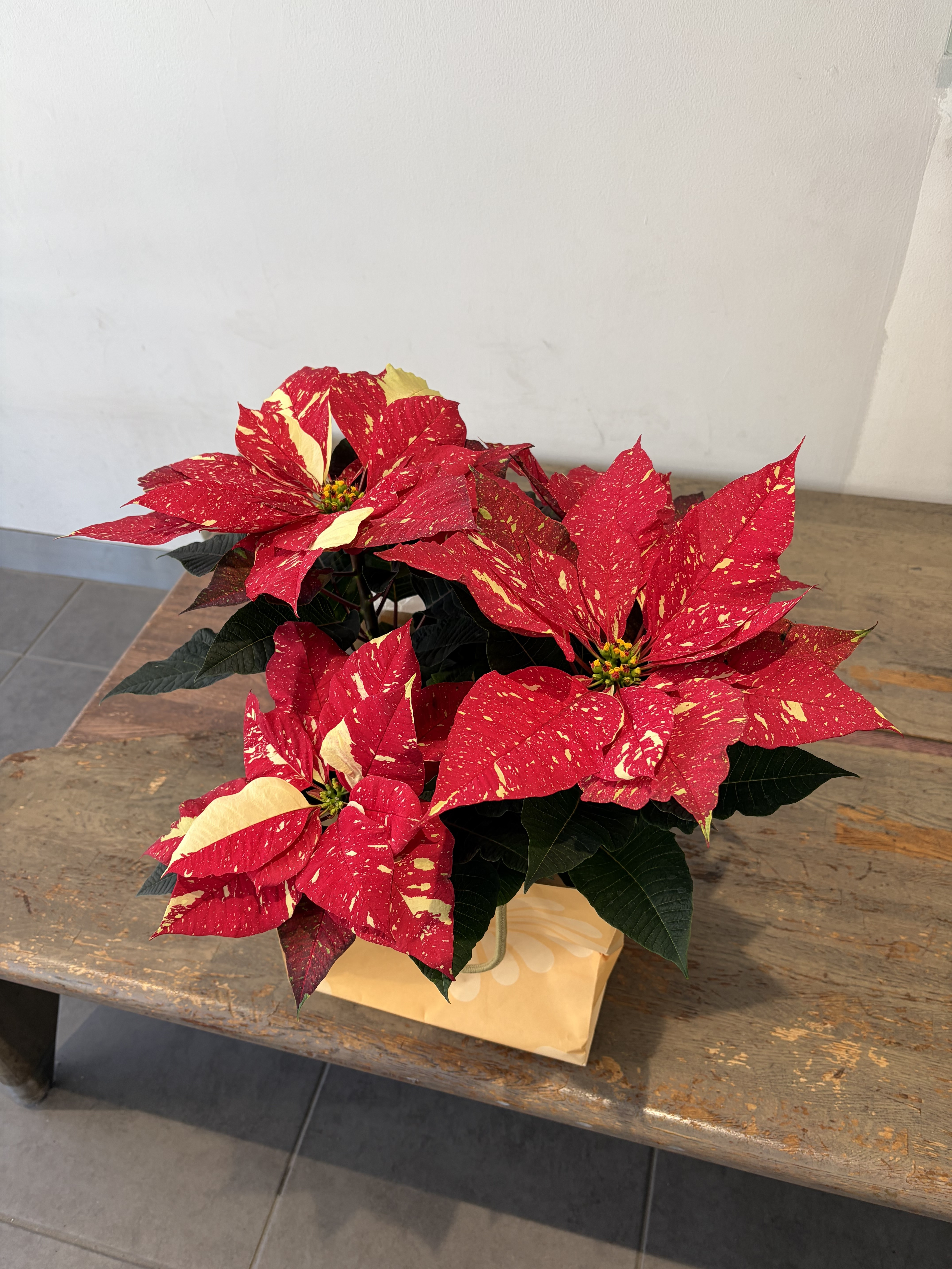 赤の苞に黄色の斑が入ったこちらのポインセチアは【マチネグリッター】という品種になります。