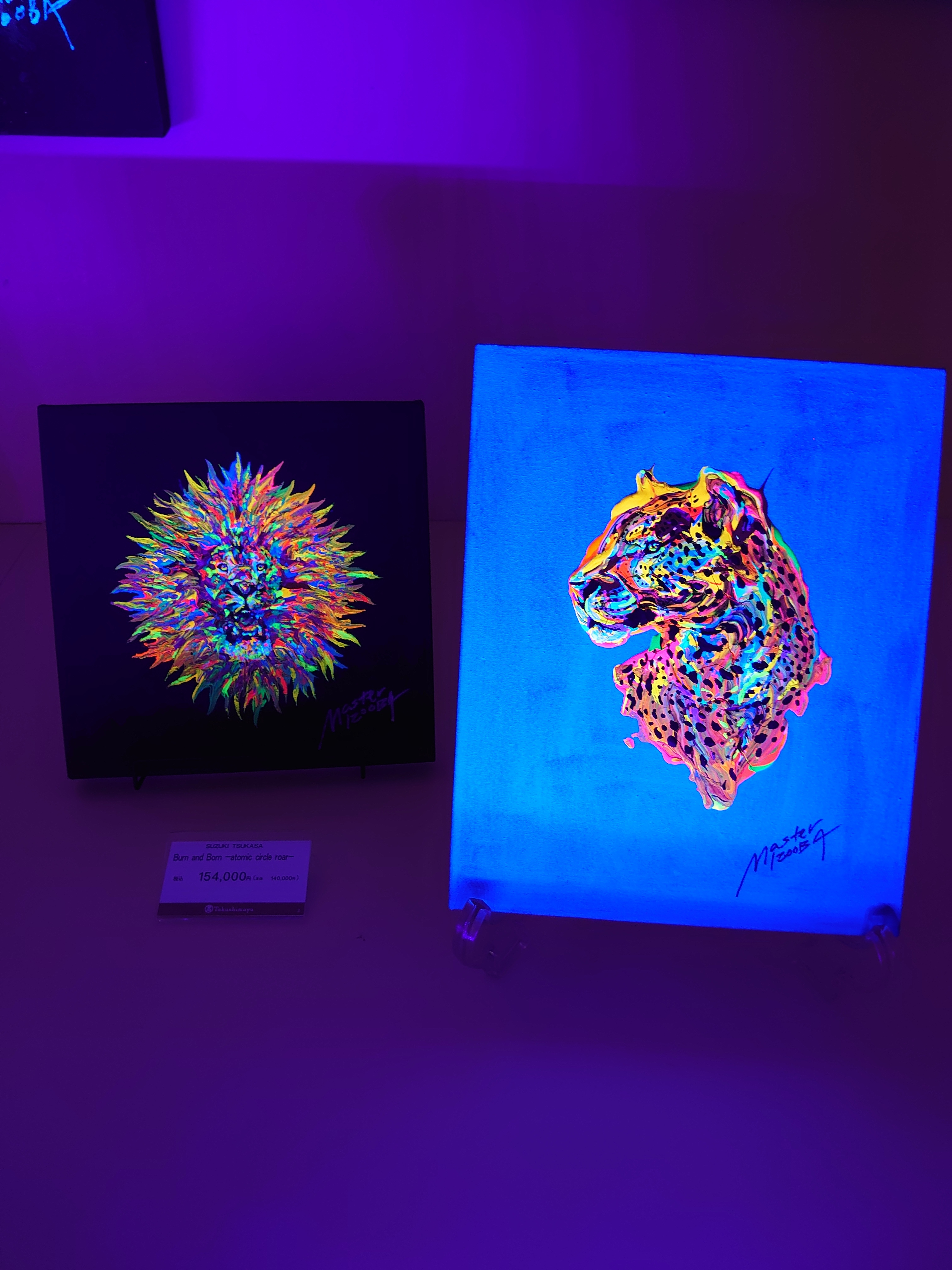 アフリカのルワンダの子供達に絵画の指導をし、子供達の生活環境改善と教育支援に貢献されている画家の鈴木掌さん。ブラックライトで照らすと、光る2パターン味わえるとても素敵な作品でした✨