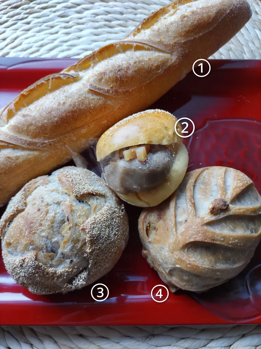①バゲット、②マロンあんパン、③リュスティック(マロン)、④イチジクとくるみのパン。