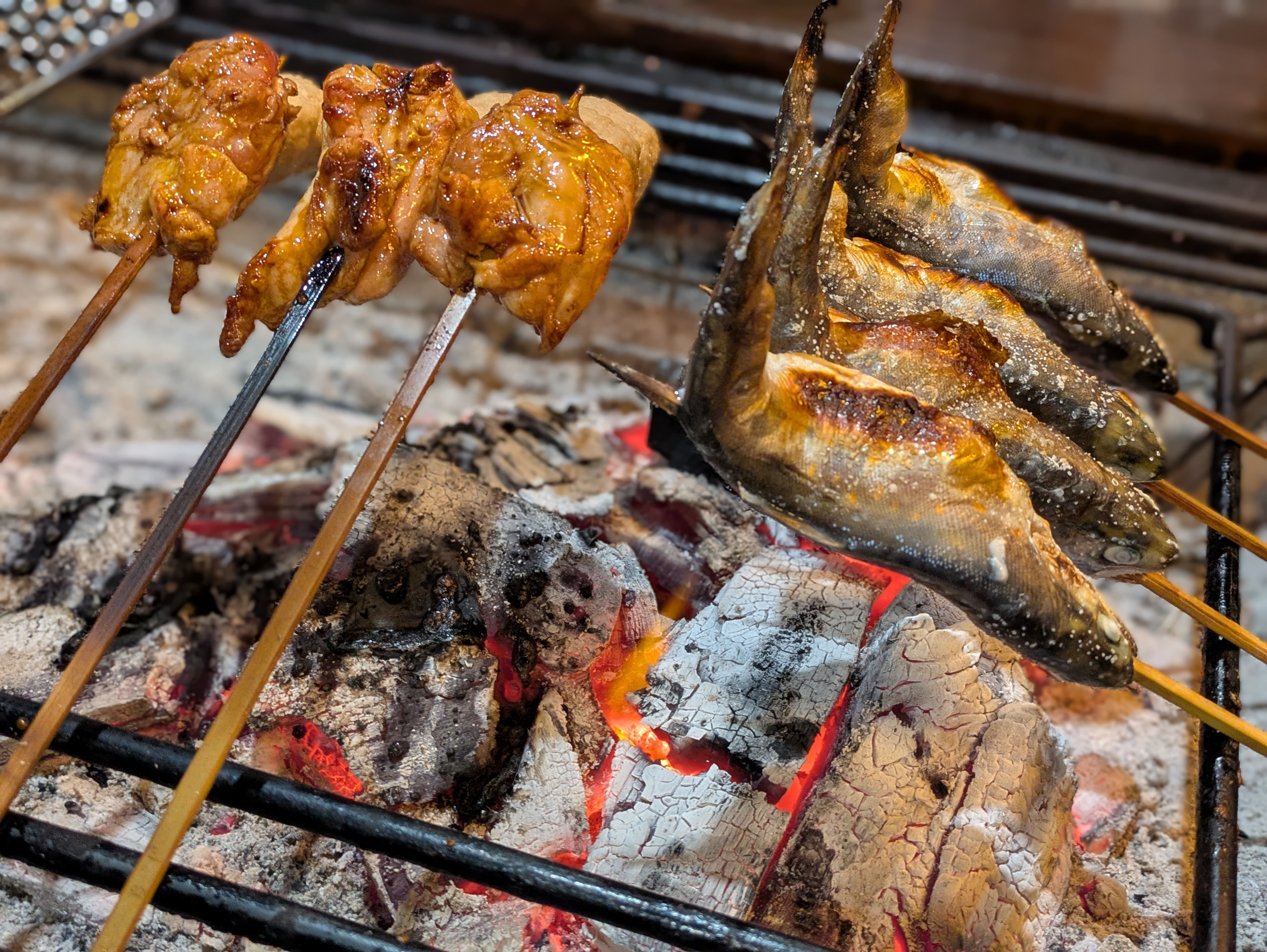 囲炉裏の炭火で焼きたて頬ばる