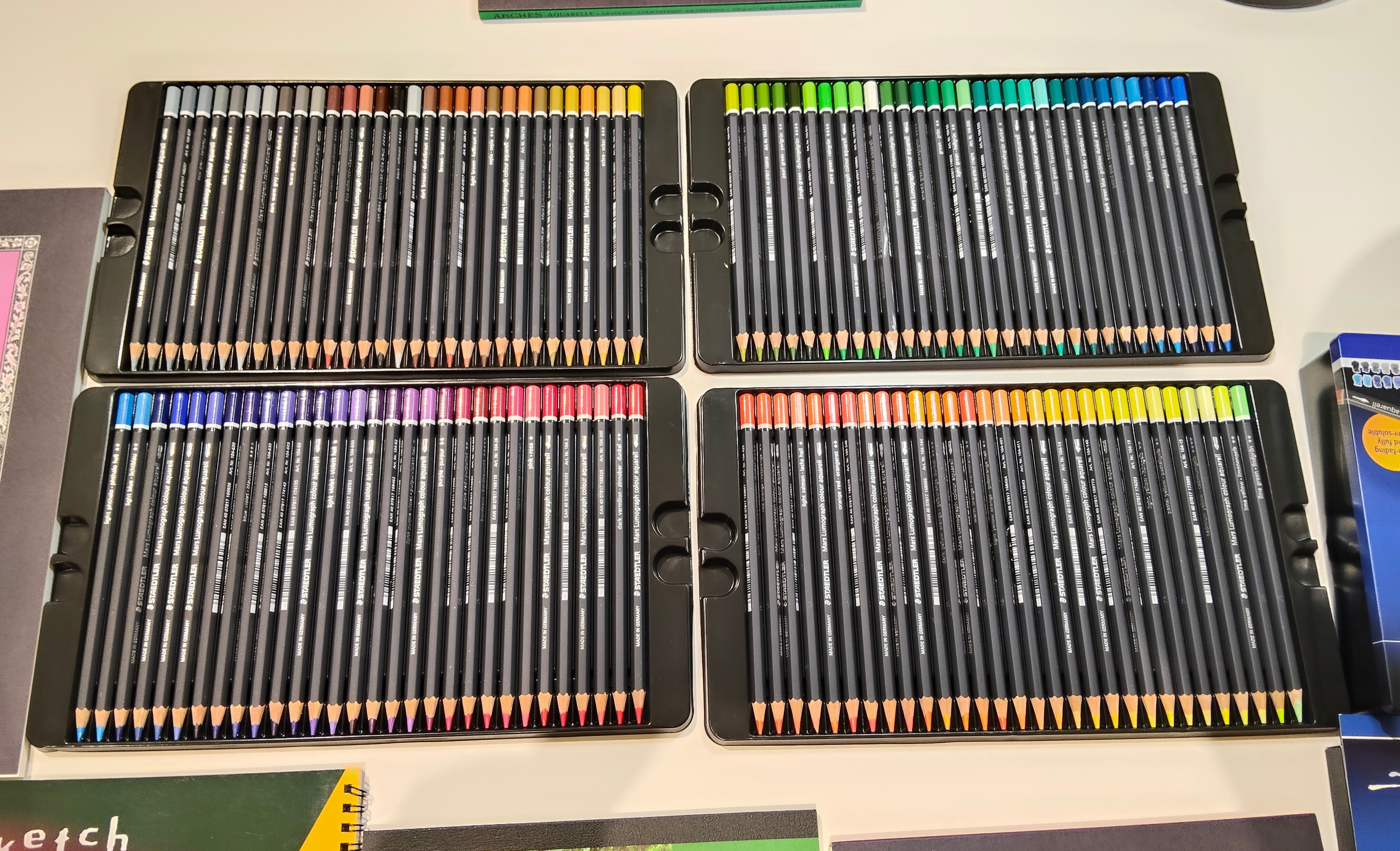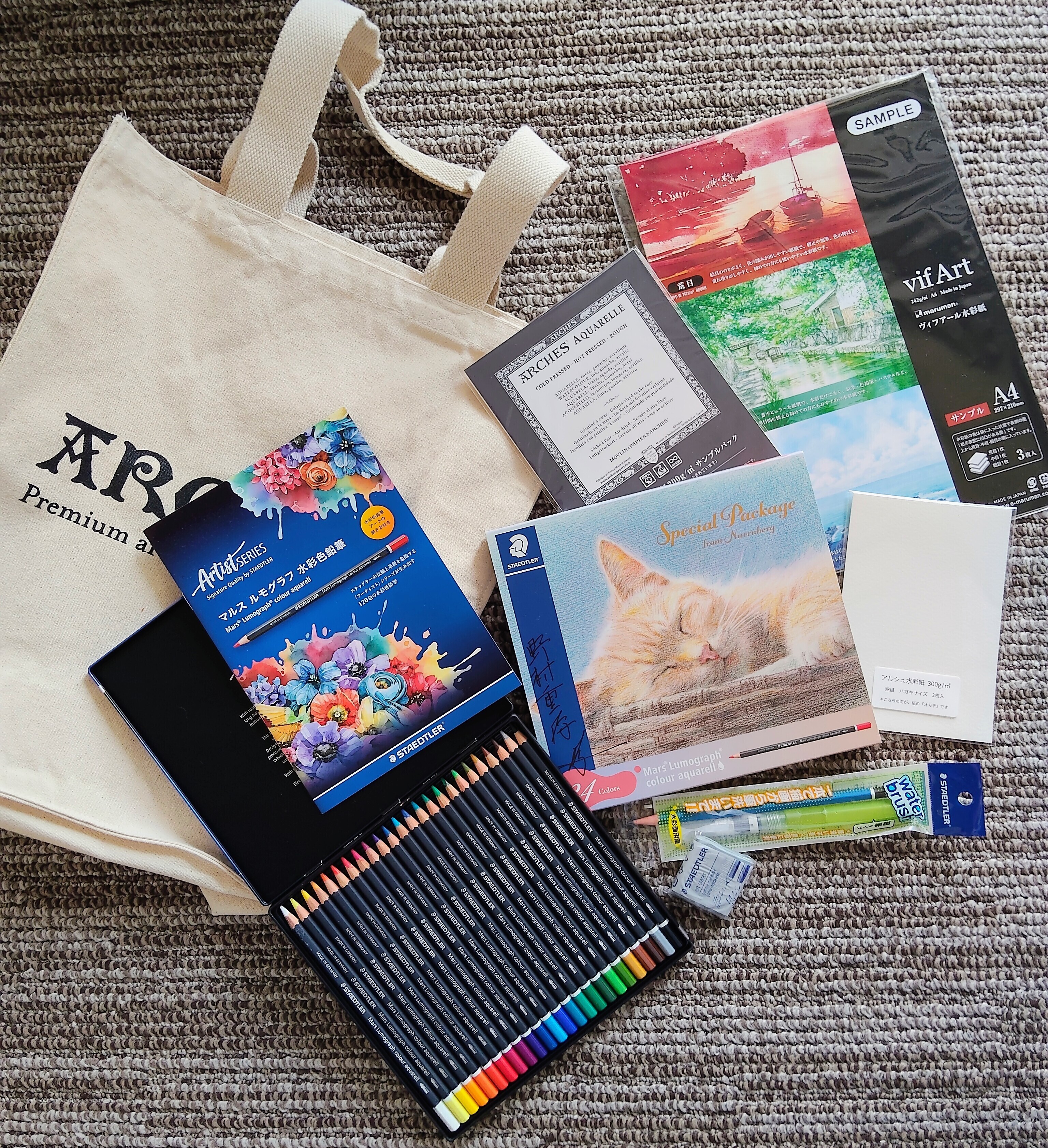 この色鉛筆は、ドイツの老舗メーカー、ステッドラーから12、24、60、120色が新発売された、「アーティスト」シリーズの、マルス ルモグラフ 水彩色鉛筆。超高級品! 素晴らしい発色! 私たちは24色を使って、時間も短いので、あらかじめ先生の鉛筆スケッチの下描きに、着彩するという流れ。紙も、アルシュ水彩紙やヴィフアール水彩紙など、こちらも優れもの! 水分を与えても、たわまないんだよね〜