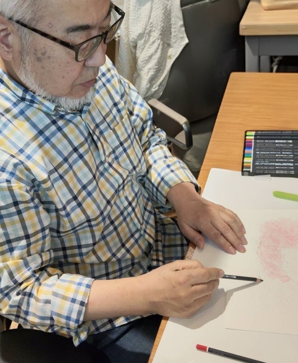 番組では野村先生は「水彩の魔術師」って称されているけれど、実は色鉛筆画もお得意らしく、サラサラサラ〜っとお描きになるから、フムフムなんて見ながら、いざ自席に戻ってチャレンジしてみるんだけど、なかなかに難しい😆