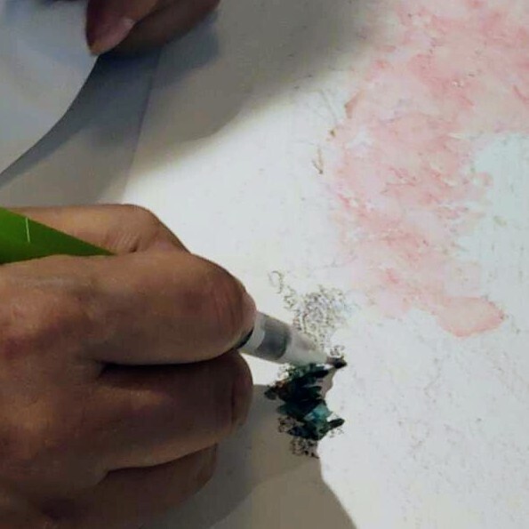まずは先生の実演。水彩色鉛筆の塗り方や水筆でのぼかし方を拝見。