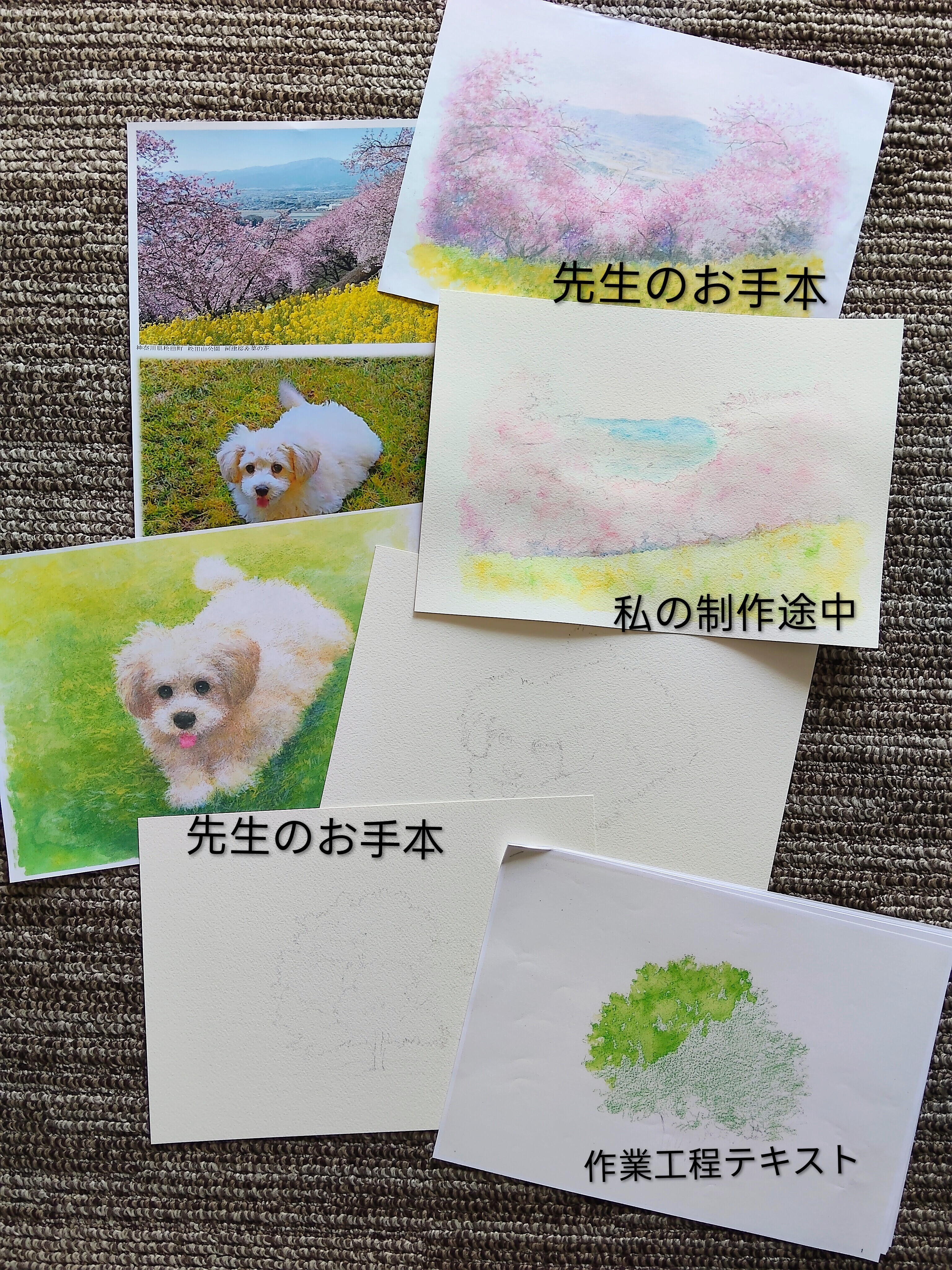 桜の他にも、お家で練習できるように、先生作のわんこや木の下描きも配布され…