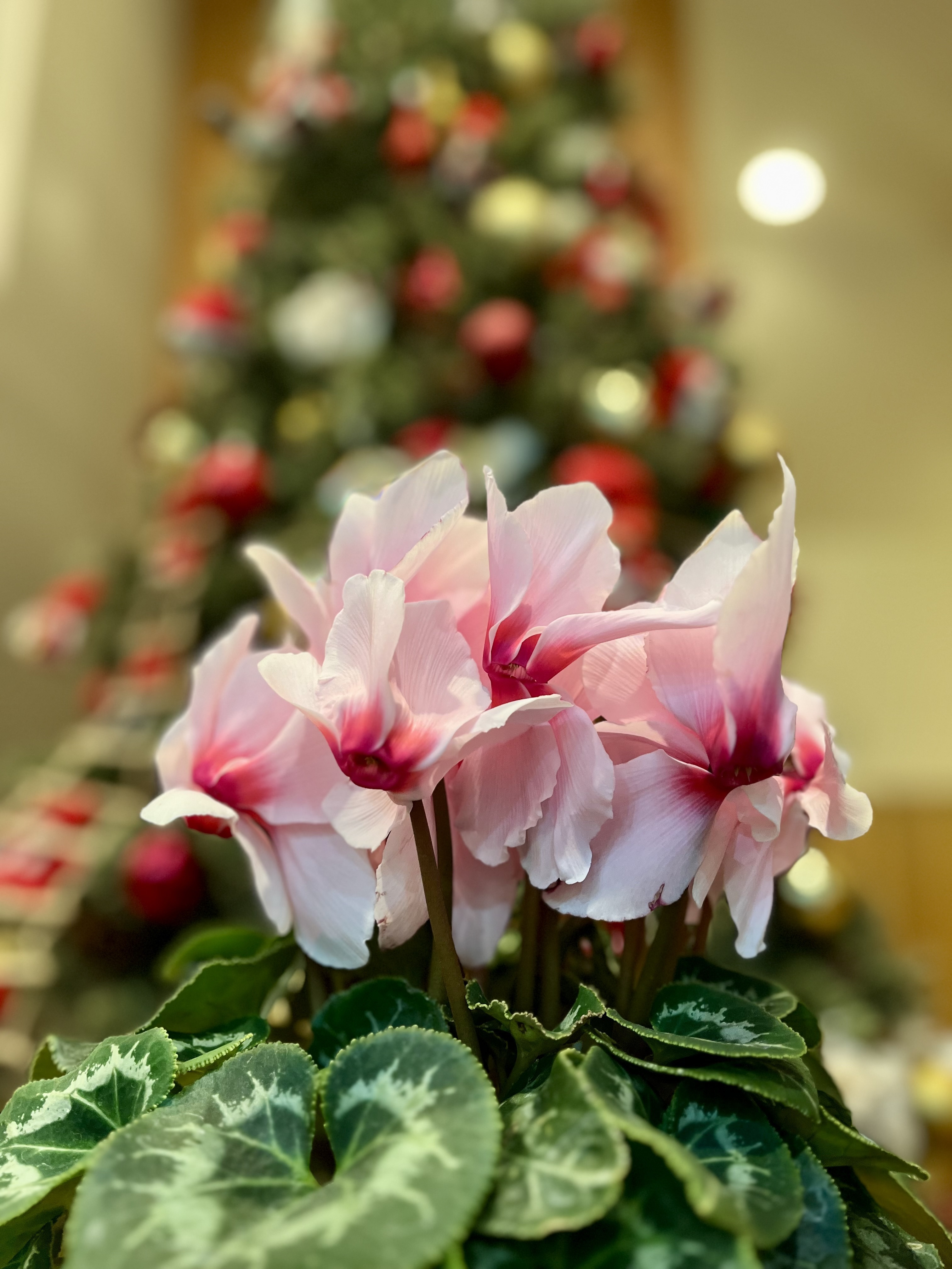 シクラメンのピンクの可愛い花びらとツリーが映えてとても綺麗😍