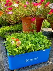 エシレ青缶にセダム森 エシレ青缶にセダムを植えました。暑い夏でも元気いっぱい育っています。伸び過ぎたので先端を刈り込みました。新芽が下の方に見えています。