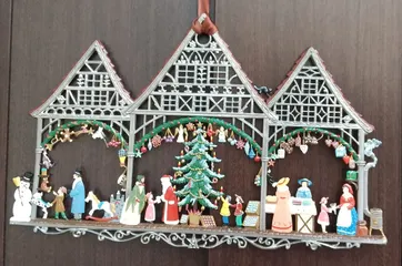 錫のヴィルヘルム・シュヴァイツァー工房のクリスマスハウス 皆様、いよいよ寒くなって参りました。クリスマスの飾りつけものんびりと進行中です。今日は、伯母からのドイツ土産のヴィルヘルム・シュヴァイツァー工房のクリスマスハウスの壁掛けを飾りました。細かく美しい細工に、見る人の気持ちが明るくなるような気がします。気に入っている飾りです。皆様も、暖かくしてお過ごし下