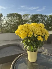 素敵なポットマム💛 初当選おめでとうございます。 青空に可愛い花片の花鉢💛 とても印象的です。 強風は花鉢にヤキモチ…?! 影響なくて良かったです☺️