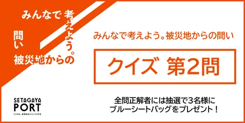 【終了】【プレゼント企画】第1問 クイズ全問正解者の中から抽選で3名様にブルーシートバッグプレゼント こちらのキャンペーンは終了しました。 「みんなで考えよう。被災地からの問い」連動クイズプレゼントキャンペーンを開催! 10/5(水)〜10/11(火)の期間中、玉川高島屋S・Cでは「みんなで考えよう。被災地からの問い」と題して防災に関するトークセッション・写真展・ワークショップ・