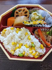 まつおかのお弁当 とうもろこしの炊き込みご飯です。 たけのこご飯は、終わりだそうです。残念😞 こちらも、美味しかったです そら豆の天ぷら入ってたぁ。