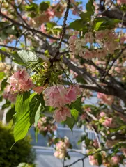 薄緑だった御衣黄🌸。ピンクが加わり、こんなに可愛くなりました🩷 久しぶりの青空で、桜も映えます。