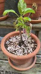 記念樹を植え替え 先月節目のお祝いをしてもらった時に息子から一才桜の鉢植え(花盛りでした)をプレゼントされました。 花が咲ききって葉が増えてきましたので植え替えして外出しにしました。 私はまだまだ伸びるこれからも花を沢山咲かせる この桜が立派に大きくなるのを見るまでは健康でいなくてはいけ
