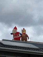 散歩していたら、家の屋根にサンタとくまさん。思わずパチリ。でも何故クマ?トナカイはいないので、サンタは歩きです。