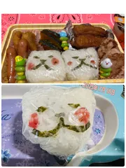 終業式の日にお弁当 今日は終業式。息子がその後お昼を食べて部活との事で、お弁当作りでした🍱 今回はLサイズのパックに、おかずをモリモリいれて、おにぎりは白ネコ。下の子の朝ごはんに、このおにぎりを出したら喜んでいましたが、しばらくして「このおにぎりグロいよ〜💦」。。。中身が梅だったので次は違う具にしようと思いま