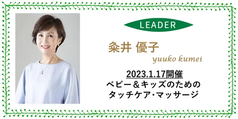 【レポート更新しました】【1月17日開催】ベビー&キッズのためのタッチケア・マッサージ コメントにレポート更新しました。リーダー:粂井 優子≫プロフィールはこちら親子コミュニケーションはここから始まる!「ベビー&キッズのためのタッチケア・マッサージ」人気のベビー&キッズのためのタッチケア・マッサージのアクティビティ参加者募集中です☺※たまがわLOOPアクティビティへ参加の際には、「たま
