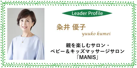 【リーダー プロフィール】粂井 優子 リーダー:粂井 優子【プロフィール】Home to Work代表GCS認定コーチ・1級家事セラピストセルフエスティームTouch協会認定HOCORUベビーマッサージセラピストウエルビーイング・ダイアログカード認定ファシリテーター親を楽しむサロン&ベビー&キッズマッサージサロン「MANIS」主宰企業研