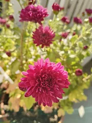 2022年秋にいただいたマムちゃんバトン、ちょっと小ぶりですが、今年も元気に咲き始めました😊今朝はよく晴れた青空に、マムちゃんの赤紫色が映え映え!😉